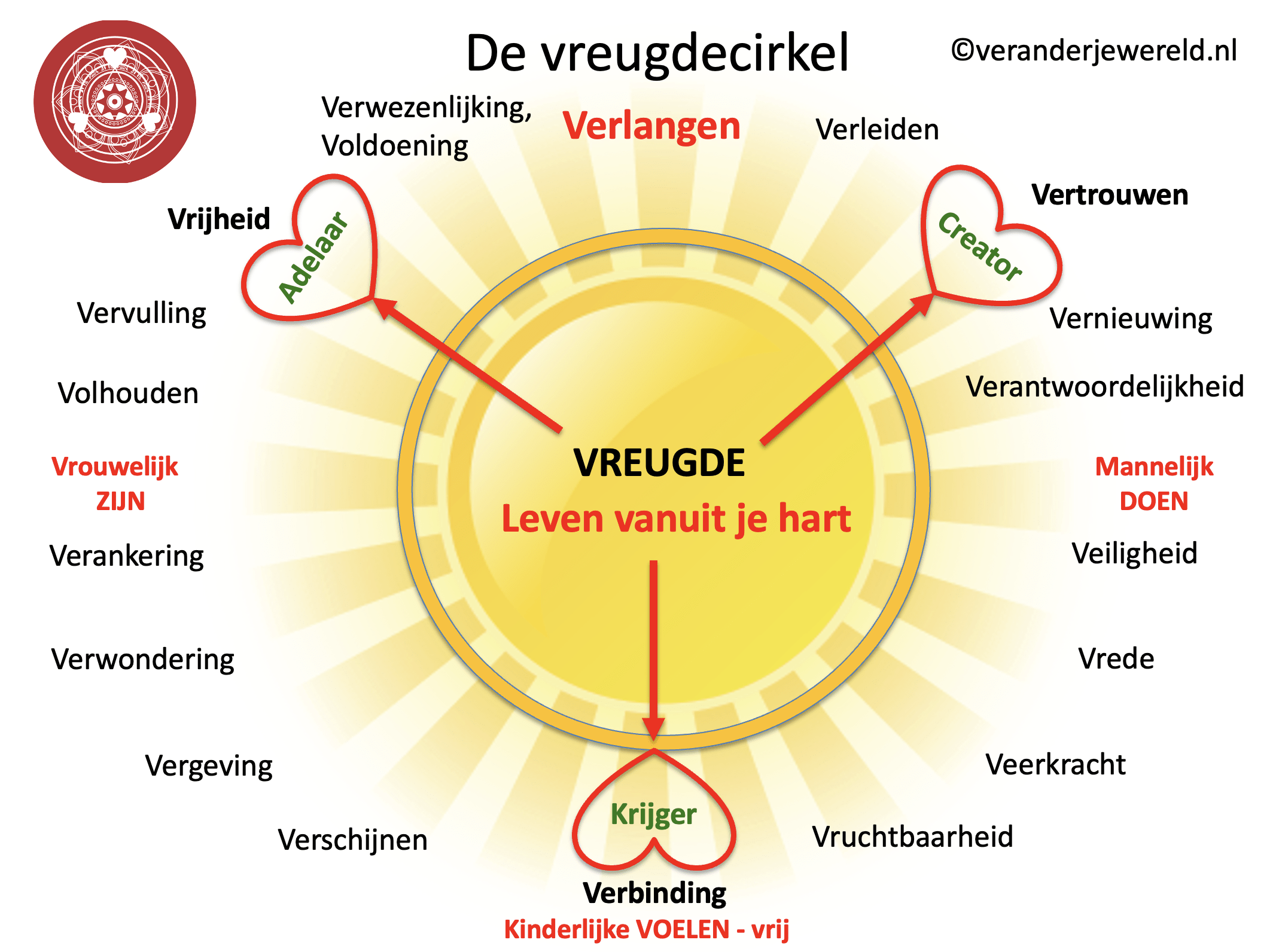 De Cirkel is de bedding waarin al het bovenstaande mag samenkomen. Het staat voor gemeenschap, afronding, doorgeven, gelijkwaardigheid en heilige ordening. De Vierdaagse vormt het veld waarin ieder deel zijn plek vindt: de wilde levenskracht, de wijze blik, het hart dat liefheeft en het water dat stroomt. In de Cirkel wordt dit alles geïntegreerd, zodat het niet bij een ervaring blijft, maar in de wereld gebracht wordt. Tijdens de retraite werken we met een aantal thema’s uit de vreugdecirkel.